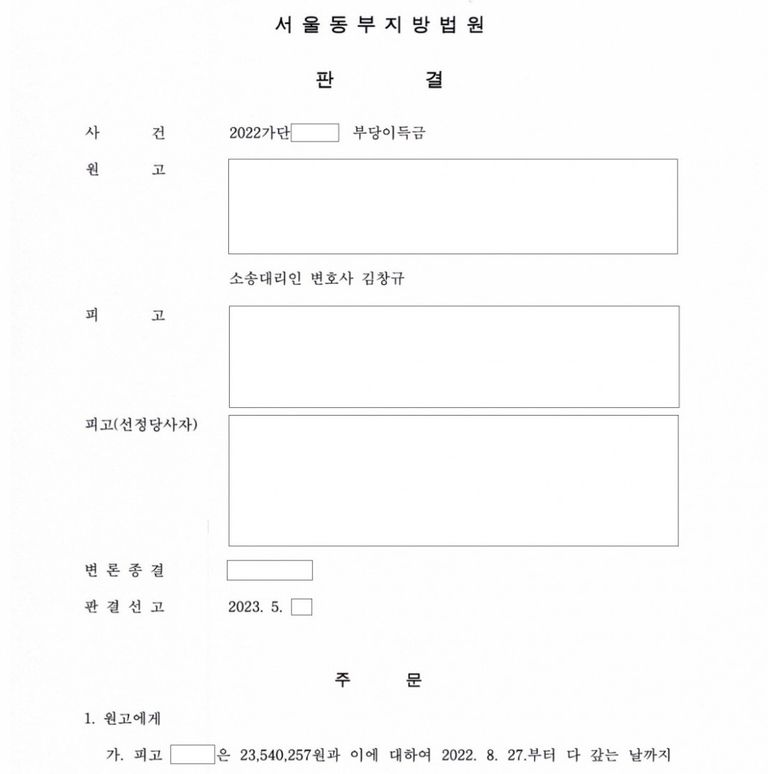 의뢰인이 동산압류경매절차에서 낙찰받아 대금을 지급하였는데, 경매절차가 무효가 되어 경매대금을 배당받은 경매채권자와 동산소유자를 상대로 이들이 배당받은 돈을 부당이득으로 반환하여 달라는 내용의 소를 제기하여 전부 승소한 사건