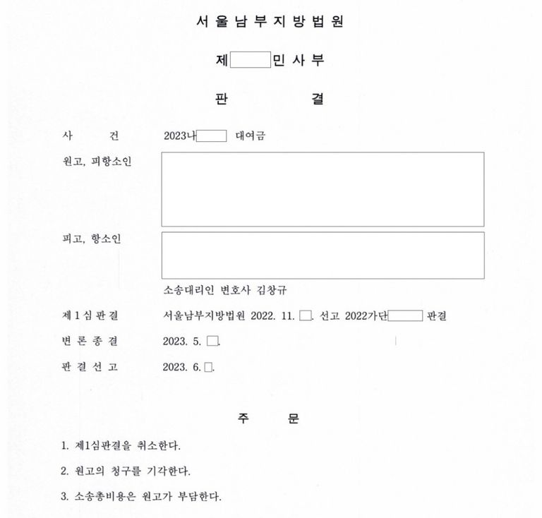 상대방이 4,000만원의 대여금 청구소송을 제기하여 제1심에서 변호사를 선임하지 않은 의뢰인이 전부 패소하였으나, 항소심에서 대여가 아닌 증여라고 주장하여 제1심 판결을 뒤집어 전부 승소함