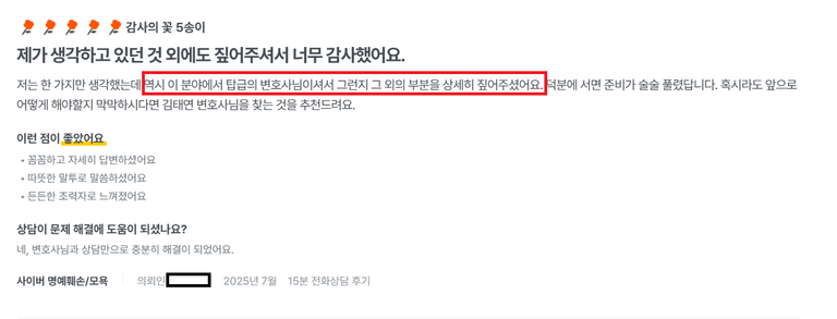 최근 김태연 대표변호사님께 모욕죄, 명예훼손죄로 상담을 받으신 상담자분께서 감사하게도(요청도 안 드렸는데), 내돈내산으로 "역시 이 분야에서 탑급의 변호사님이셔서 그런지 상세히 짚어주셨다."