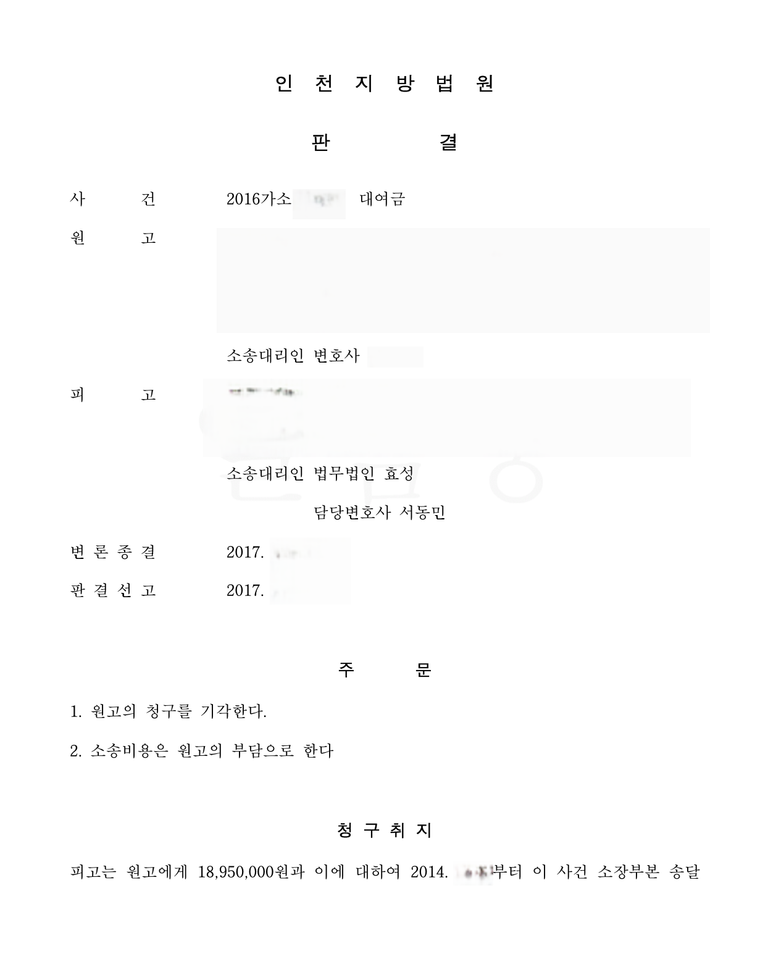 저는 즉각 응소하여 의뢰인은 채무자의 가족이고 계좌만 제공하였을 뿐 실제 채무자가 아님을 주장 입증하였고 법원은 원고 청구를 기각하였습니다.