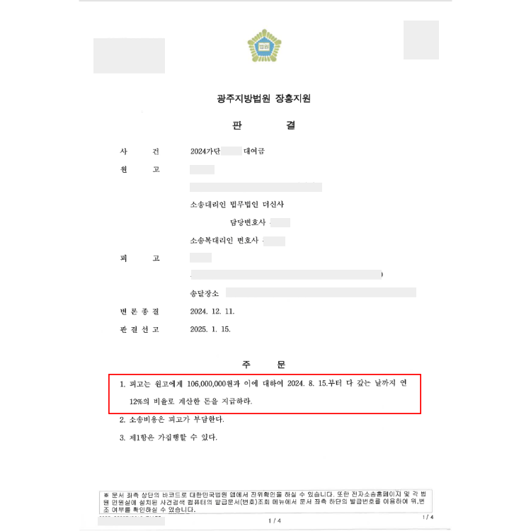법원은 B씨에게 원고가 청구한 1억 600만 원 전액과 12%의 연체 이자까지 지급하라고 판결하였고,