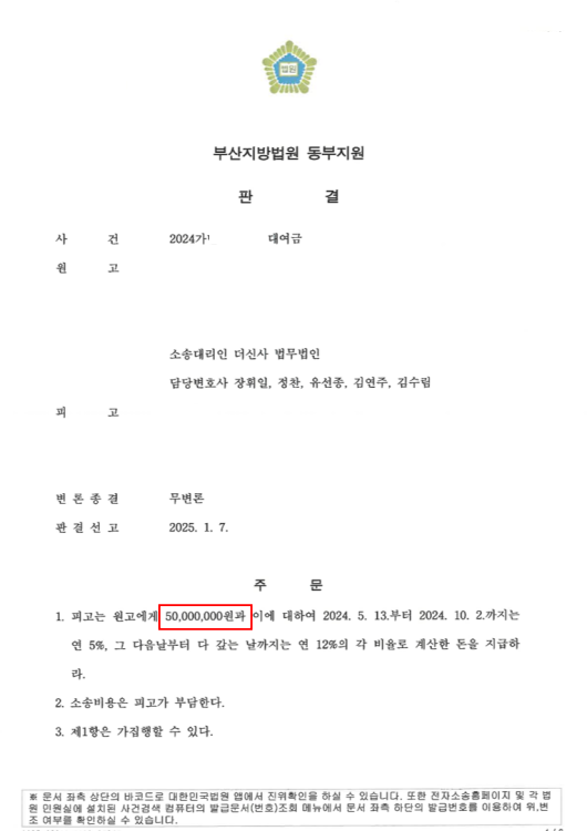 사건 결과: 대여금 전액 반환 인용