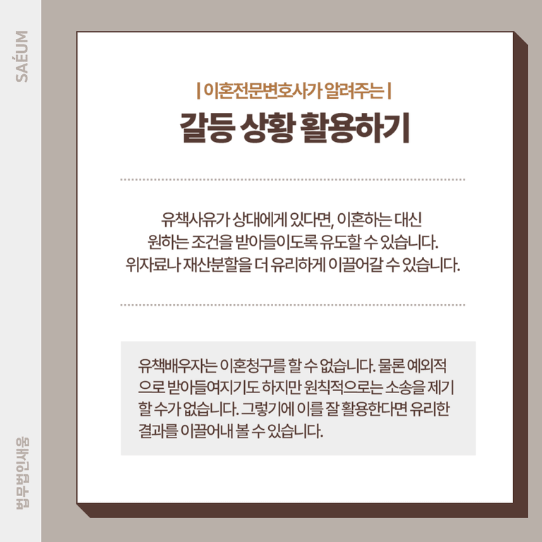 유책배우자는 이혼청구를 할 수 없습니다. 물론 예외적으로 받아들여지기도 하지만 원칙적으로는 소송을 제기할 수가 없습니다. 그렇기에 이를 잘 활용한다면 유리한 결과를 이끌어내 볼 수 있습니다. 예를 들어 상대방이 상간자와 결혼을 하고 싶어하거나 혼외자가 있는 경우 이혼을 해야 정식으로 혼인신고 및 출생신고를 하는 것이 가능합니다. 따라서 이를 이용하여 이혼을 해주는 대신에 원하는 조건을 받아들이도록 유도할 수 있습니다. 또한 상대방의 잘못으로 인해서 정상적인 부부관계가 파탄으로 이어지게 되고 그로 인해 자녀들까지도 큰 고통을 받게 되었다는 점을 강조하여 재산분할이나 위자료 등을 더 유리하게 이끌어낼 수도 있습니다.