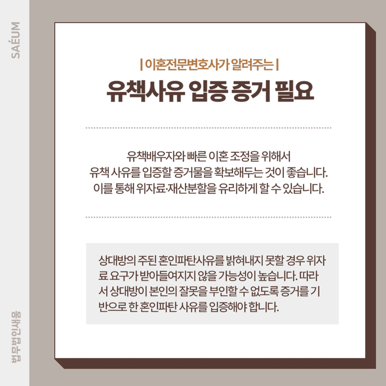 빠른 조정 이혼을 위해서 배우자 외도에 대한 증거물을 확보해 두시는 것이 좋습니다. 상대방이 외도 사실을 인정하지 않을 수도 있기 때문인데요. 상대방의 주된 혼인파탄사유를 밝혀내지 못할 경우 위자료 요구가 받아들여지지 않을 가능성이 높습니다. 따라서 상대방이 본인의 잘못을 부인할 수 없도록 증거를 기반으로 한 혼인파탄 사유를 입증해야 합니다.