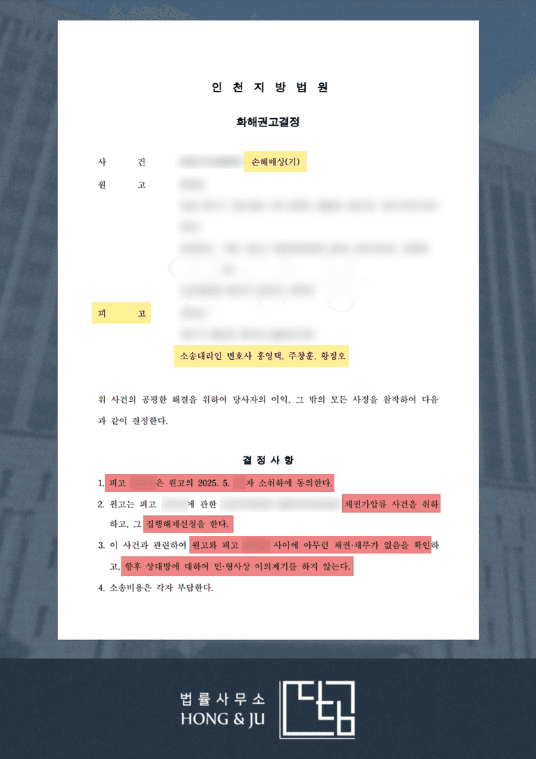 이에 법원은 이 사건 소취하와 함께 채권가압류 사건 또한 취하하고, 집행해제신청과 더불어 향후 이 사건으로 민, 형사상 이의제기를 하지 않는다는 내용으로 화해권고결정을 내렸습니다.
