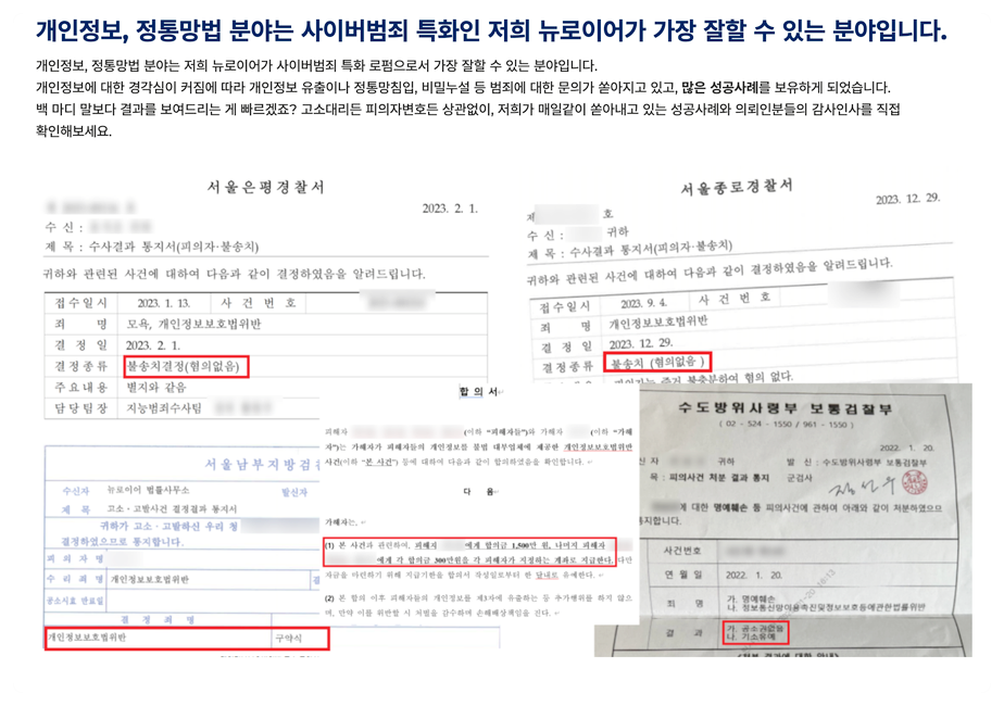 저희가 사이버 범죄 사건을 특화하며 비밀누설죄, 비밀침해 사건을 책임지며 도움을 드리고 있습니다.