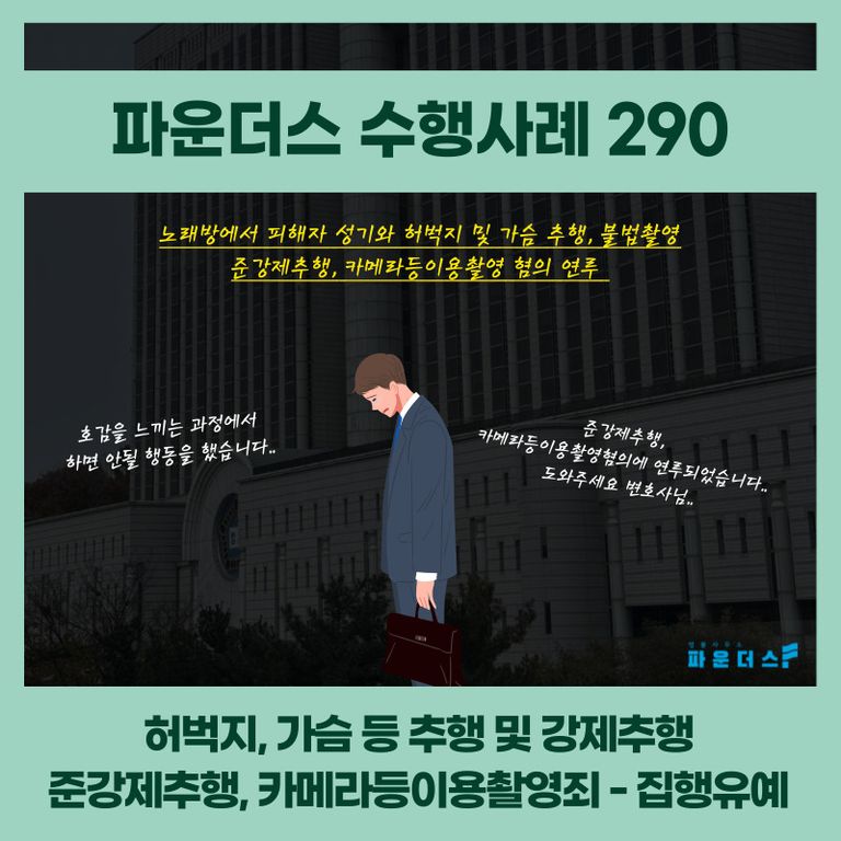 그 결과 의뢰인은 노래방에서 만취한 피해자의 성기, 허벅지, 가슴을 추행하고 이를 피해자의 의사에 반해 불법촬영한 준강제추행 및 카메라등이용촬영 혐의에서 집행유예 판결로 실형을 면할 수 있었습니다.