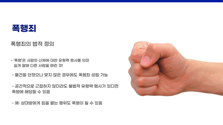 '폭행'은 사람의 신체에 대한 유형력 행사를 의미합니다. 쉽게 말해 사람을 때리는 행위를 의미합니다.