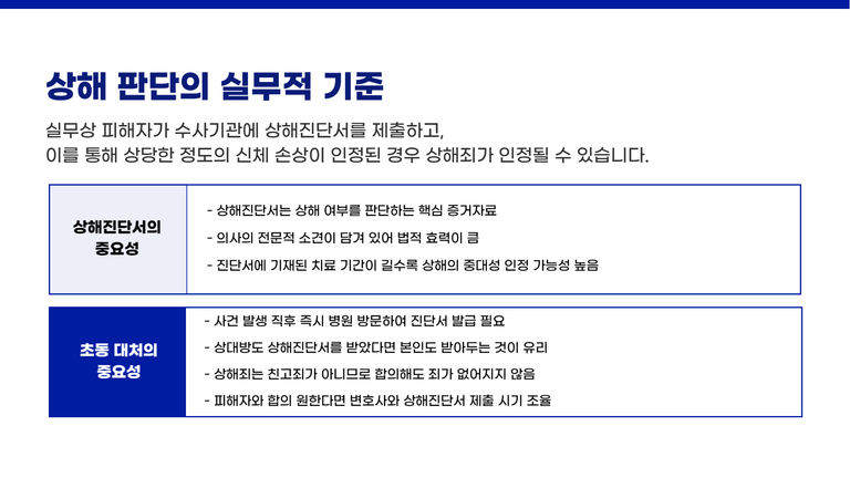 그런데 누군가와 예기치 못한 다툼이 발생했을 때 어떤 사람은 사건 직후 곧바로 상해진단을 받았지만 다른 한 사람은 상해 진단을 받지 않고 일정 시간이 경과했다고 가정해 봅시다. 상해 진단을 받은 사람이 상대방을 고소한다면 상해진단을 받지 않은 사람은 곤혹스러운 상황이 발생할 수 있습니다. 즉, 상해진단을 받지 않은 사람만 일방적으로 상해죄로 처벌받을 수도 있는 것입니다. 이처럼 분쟁이 발생하면 초동 대처가 매우 중요합니다.