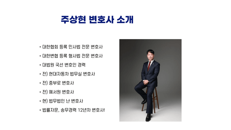 주상현 변호사는 대한변호사협회 등록 형사법/민사법 전문 변호사입니다. 수사입회, 고소장 작성, 변호인 선임 등 대응이 필요하시면 언제라도 연락 주시기 바랍니다.
