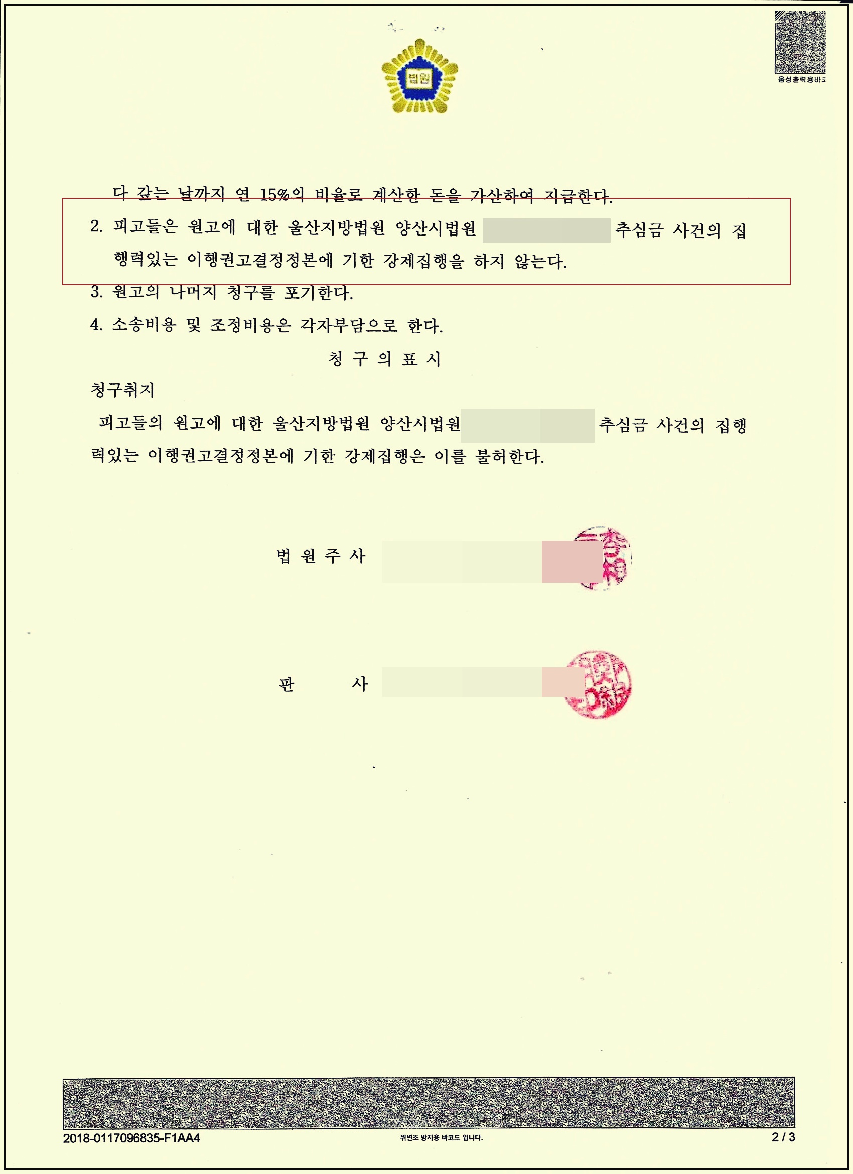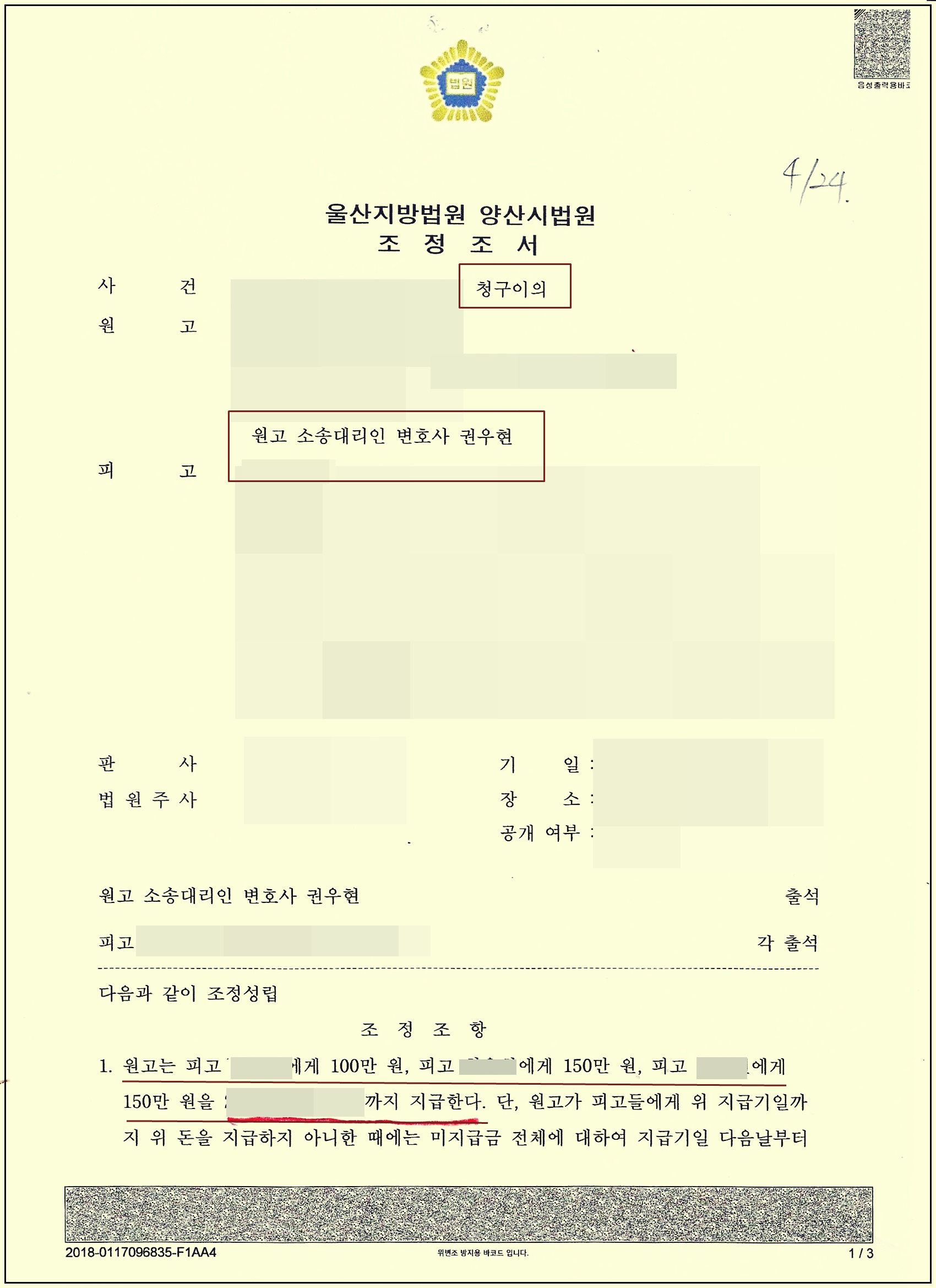 다만, 집행권원에 의해 집행이 종료되면 청구이의의 소가 의미가 없으니, 집행이 들어오기 전이고 이에 대해 항변할 사유가 있다면 충분히 소를 제기해 볼 만한데, 아래 조정조서의 경우에는 확정된 이행권고결정에 대해 뒤늦게 패소한 피고가 승소한 원고들을 상대로 청구이의의 소를 제기하여 소액만 지급하고 조정으로 마무리 지은 사안입니다.