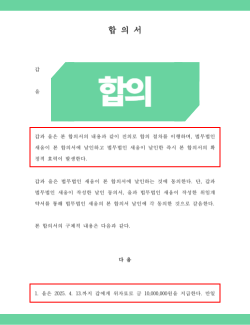 빠르게 사건을 마무리하기 원하셨기 때문에 A씨의 의사를 반영, 3월 26일에 최종 합의서가 작성되어 등기로 전달을 드릴 수 있었는데요. 구상금 포기 조건으로 1000만 원의 합의금을 지급하고, 연락 및 만남 위반 시 위약벌 300만 원, 비밀 누설 금지 및 알게 된 사람이 있을 경우 1인당 위약벌 300만 원의 조건으로 합의를 마칠 수 있었습니다.
