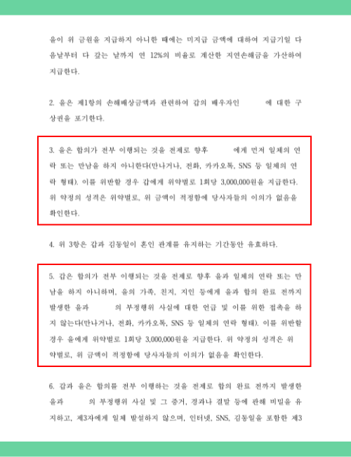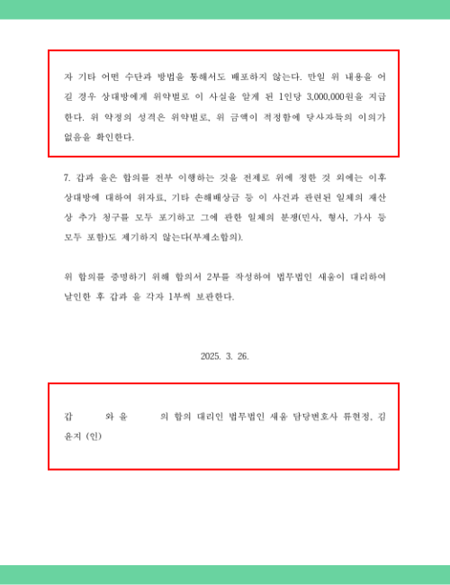 합의금이 정해진 후 의뢰인께서는 지속적인 상간녀 협박을 막기 위해 위약벌 1000만 원 조항을 넣고자 하셨는데요. 이 부분을 반영하여 수정하자 B씨는 합의 의사를 철회하였고, 이후 합의를 이끌어내기 위해서 바로 전화 통화를 통해 위약벌 300만 원으로 낮추는 대신, 단 1회만으로도 큰 타격을 줄 수 있는 비밀 누설 금지에 대해서는 ‘1회’가 아닌 ‘1인당’ 위약벌 300만 원으로 수정하여 A씨를 보호할 수 있도록 하였습니다.