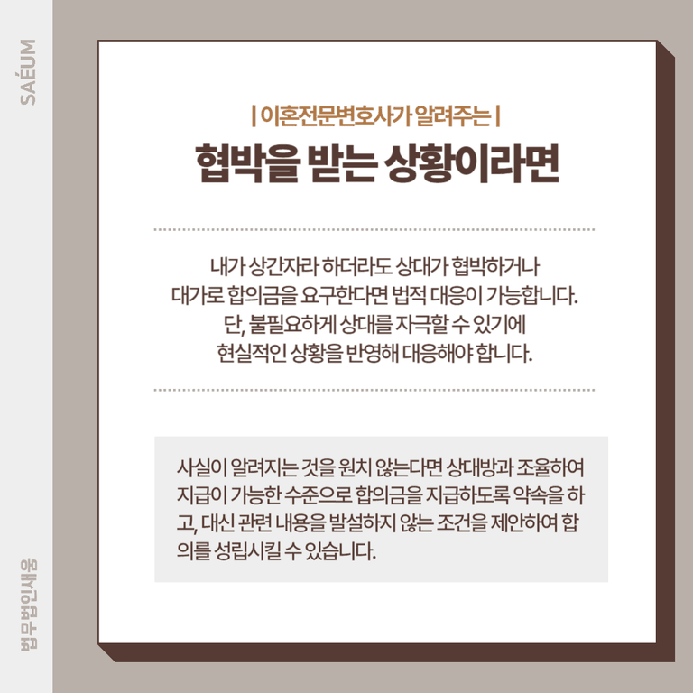 사실 상대방이 협박을 하거나 부정행위에 대한 사실을 주변에 고지하겠다며 합의금을 요구하는 경우 법적인 대응을 할 수 있습니다. 설령 발설된 내용이 사실이라고 하여도 사실적시 명예훼손으로 고소를 할 수 있기 때문인데요. 또한 협박죄도 적용될 수가 있는 사안이므로 형사상, 민사상의 대응이 가능합니다.