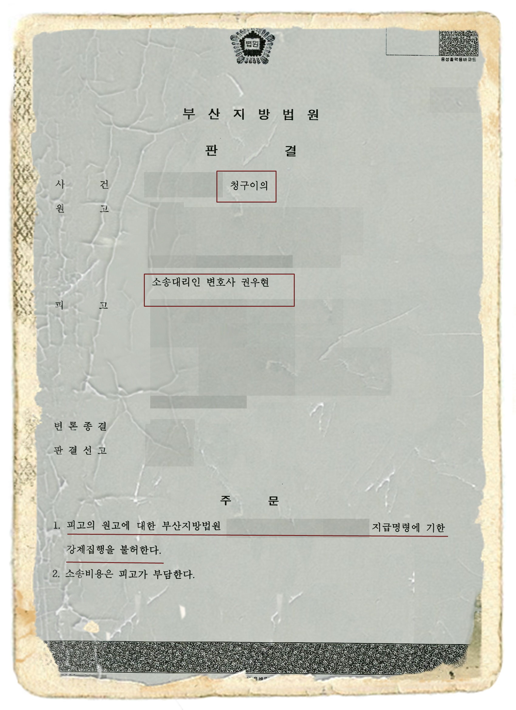 위 판결은 지급명령절차에서 패소(이의 미제기로 인하여 지급명령 확정)한 채무자가, 지급명령을 받은 채권자를 상대로 뒤늦게 청구이의의 소를 제기하여 승소한 사례인데, 청구 이의 사유는 지급명령신청 채권자의 채권이 이미 시효로 인하여 소멸하였다는 것입니다.