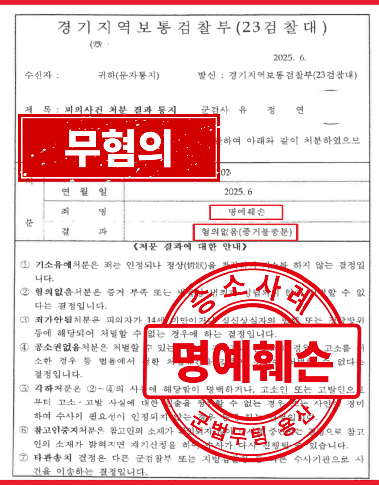 “혐의없음(증거불충분)”으로 무혐의 처분을 결정하였습니다.