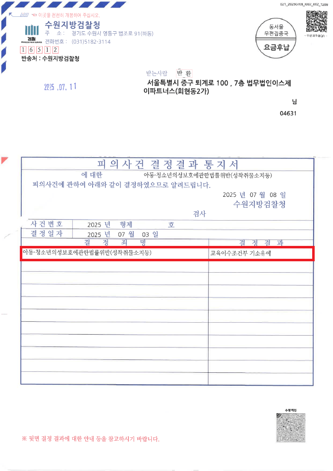이에 A씨는 어떻게든 기소유예 처분을 받기 위해 자신을 도와줄 변호사를 수소문하기 시작하였고, 결국 트위터 '섹트' 사건과 아청법위반(성착취물소지등) 사건을 다수 수행하며 성공적으로 해결하고 있는 저를 찾아와 도움을 요청하였습니다.