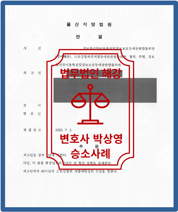 저희 법무법인 해강은 법리적인 검토를 통하여 의뢰인 상황에 맞춘 변호인 의견서 등 작성을 통하여 의뢰인을 위해 최선을 다하였고 이에 [성공]을 이끌어냈습니다.