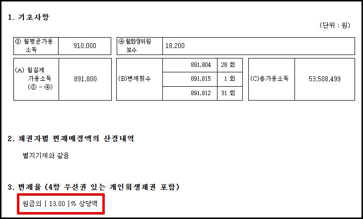 그 결과, 총 채무 4억 3천만 원 중 13% 수준인 약 5,460만 원을 60개월 동안 성실히 변제하고, 나머지 약 3억 7천만 원을 탕감받는 회생 인가결정을 받았습니다.
