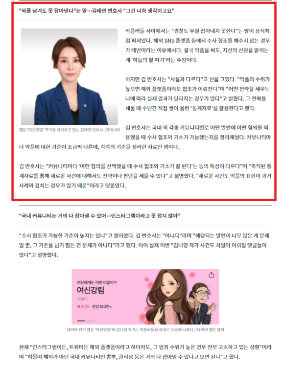 [출처 : 로톡뉴스, 김태연 변호사님 여신강림 야옹이작가님 대 고소 관련 인터뷰]
