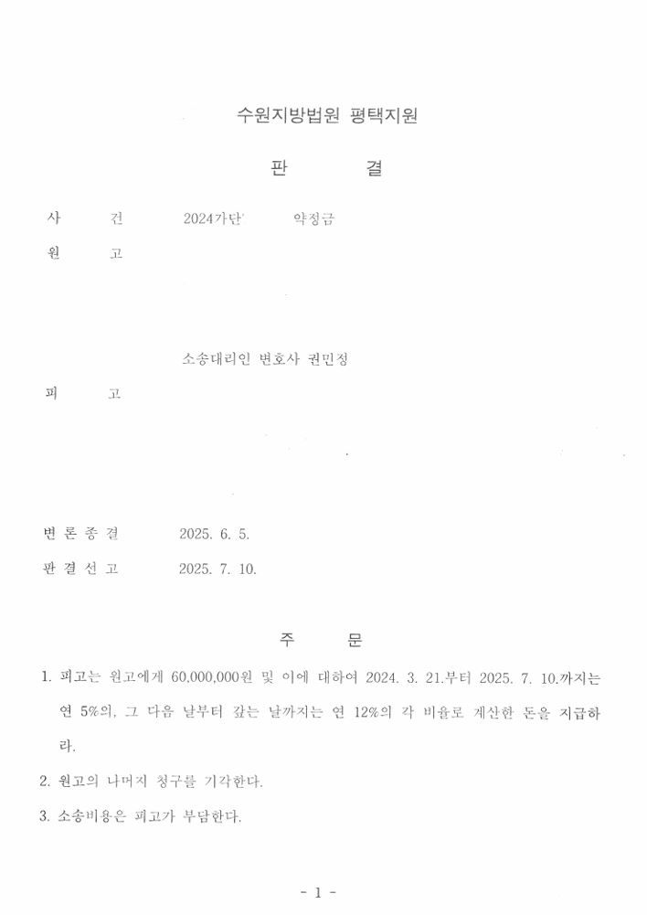 그 결과 재판부는 원고의 주장을 받아들여 약정금 전액을 반환하라는 사실상 전부 승소 판결을 내렸습니다.