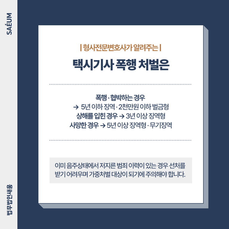 운행 중인 운전기사에게 폭행을 가하게 될 경우 이로 인해서 교통사고가 발생할 위험이 증가하며 운전기사는 물론 다른 이들에게도 큰 피해를 줄 수 있기에 엄중하게 처벌을 하고 있습니다.