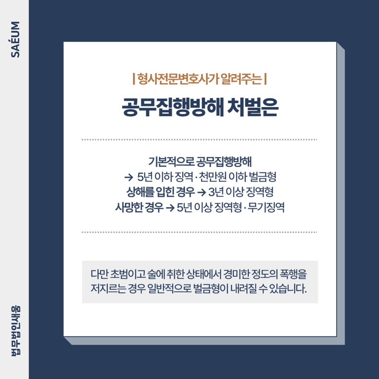 기본적으로 공무집행방해는 5년 이하 징역이나 1000만 원 이하의 벌금형에 처해지게 되나 상해를 입힌 경우 3년 이상, 사망을 하게 되는 경우 5년 이상의 징역이나 무기징역형이 내려오게 될 수 있습니다.