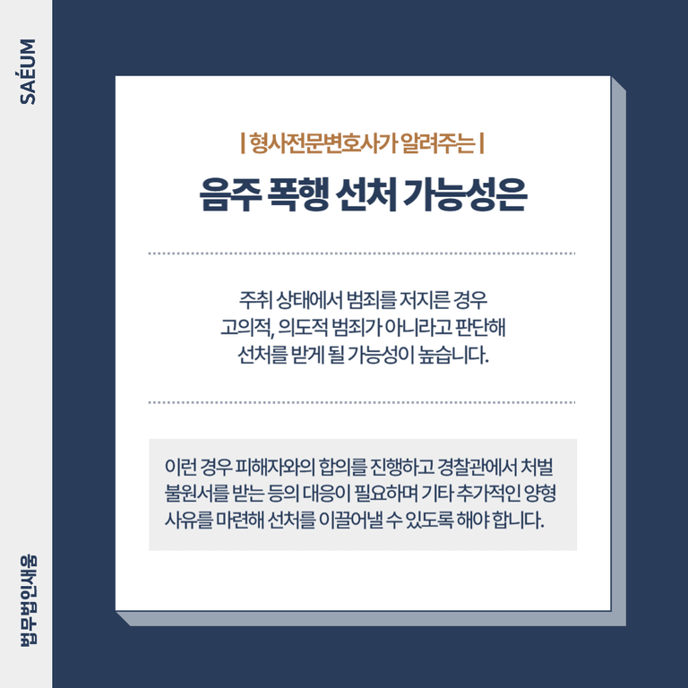 이때, 음주 폭행일 경우 어느 정도 감안이 되기는 하겠으나 혐의 자체가 성립되지 않는 것은 아니므로 긍정적으로 보기는 어렵습니다. 특히 이미 음주 상태에서 저지른 범죄가 다수 있을 경우에는 이로 인해 선처를 받기 어려우며 가중처벌 대상이 되기에 주의해야 합니다.