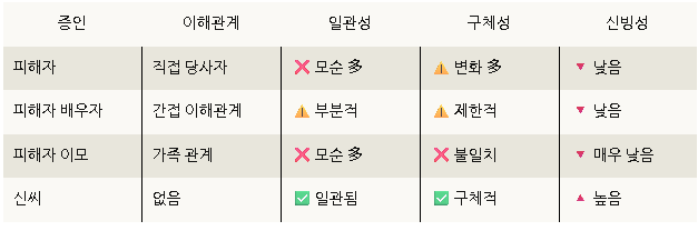 ☑️ 기존 증인들의 진술이 모순되거나 일관성 없음