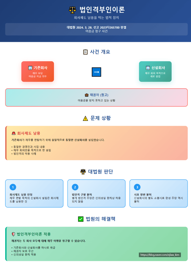 최근 대법원은 기존 회사가 채무를 면탈할 목적으로 형태와 내용이 실질적으로 동일한 신설 회사를 설립한 경우, 채권자는 기존 회사뿐만 아니라 신설 회사에게도 채무 이행을 청구할 수 있다는 중요한 판단을 재확인했습니다(대법원 2024. 3. 28. 선고 2023다265700 판결). 이 판결은 회사 채무 회피 시도에 대한 법원의 엄정한 시각과 채권자 보호의 중요성을 다시 한번 강조합니다.