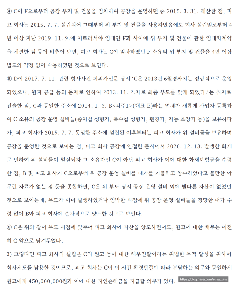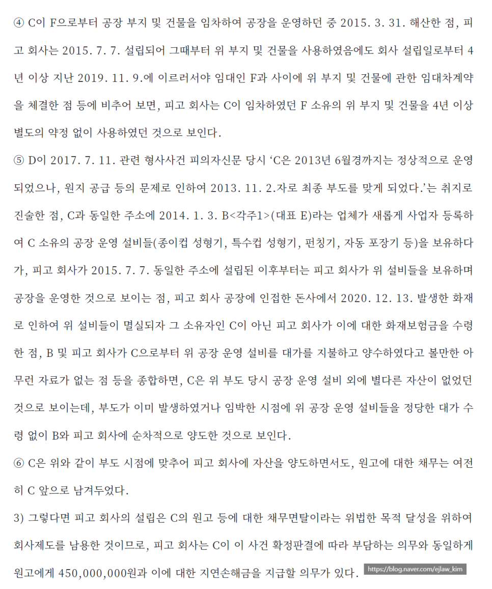 즉, 법인격 부인이 인정되는 상황에서는 신설 회사가 자신은 기존 회사와 별개임을 전제로 하는 어떠한 주장(소멸시효 완성 등)도 할 수 없다는 것입니다.
