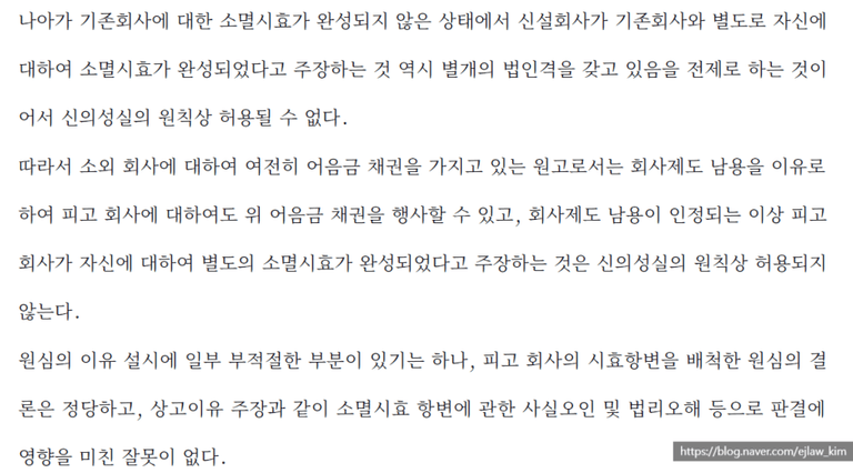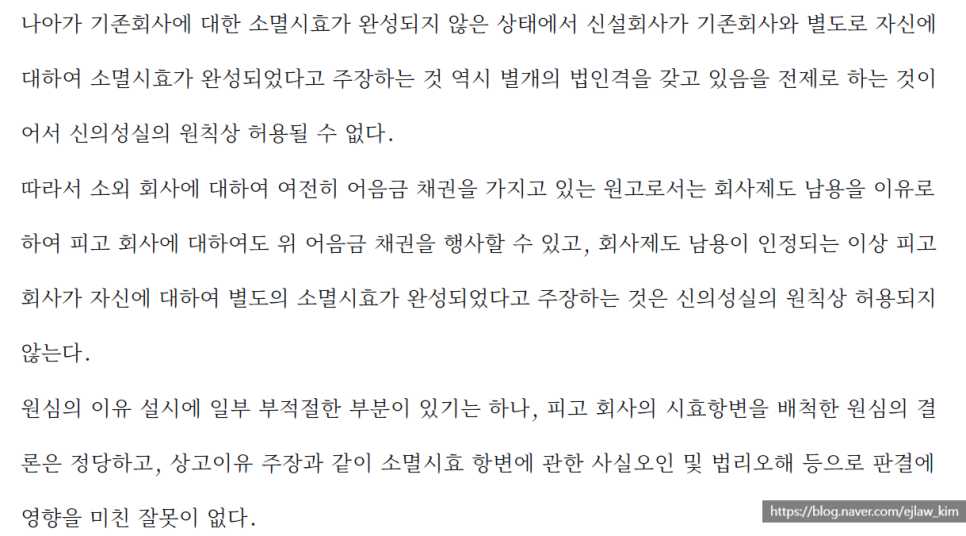 하지만 대법원은 이러한 주장에 대해 "기존회사에 대한 소멸시효가 완성되지 않은 상태에서 신설회사가 기존회사와 별도로 자신에 대하여 소멸시효가 완성되었다고 주장하는 것 역시 별개의 법인격을 갖고 있음을 전제로 하는 것이어서 신의성실의 원칙상 허용될 수 없다"고 판단하며 피고의 소멸시효 항변을 받아들이지 않았습니다.