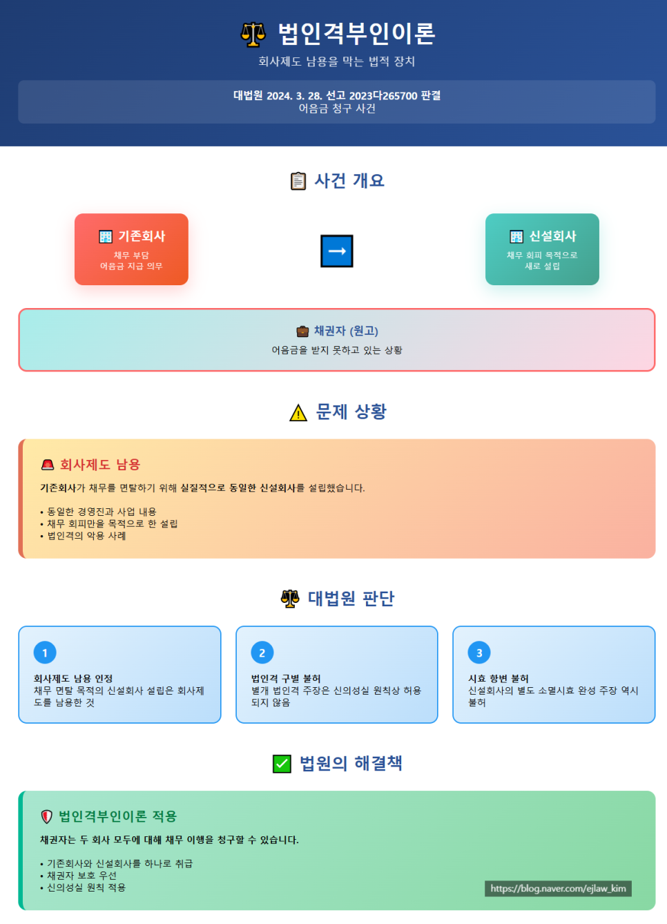 오늘은 이 대법원 최신 판결의 내용을 중심으로, 법인격 부인 법리는 무엇이며, 어떤 경우에 적용되는지, 그리고 이러한 상황에서 채권자가 어떻게 대응하여 채권을 확보할 수 있는지에 대해 자세히 알려드리겠습니다.