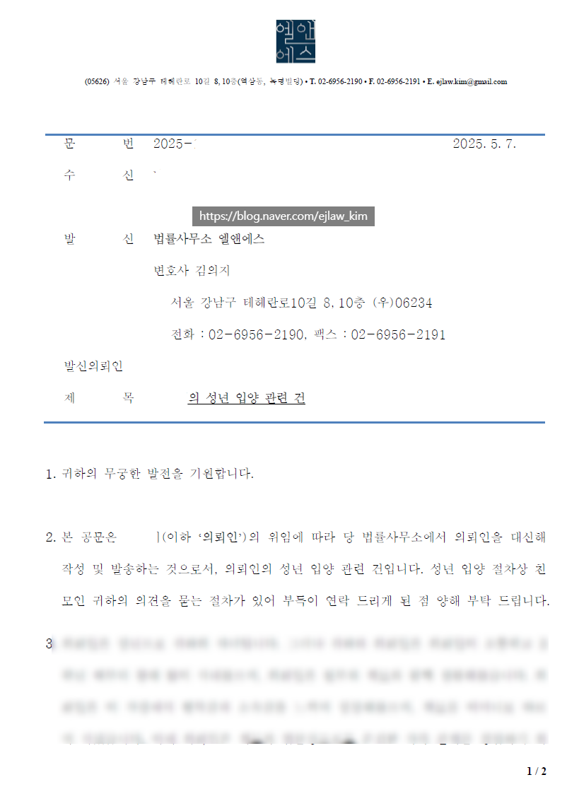 안녕하세요, 가족법의 진심을 다하는 법률사무소 엘앤에스 김의지 변호사입니다.