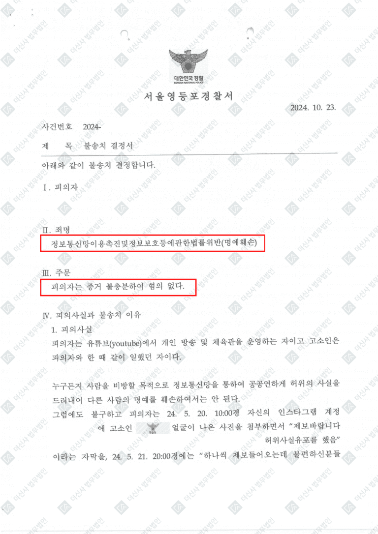비방 목적도 불분명해 증거 불충분으로 혐의를 인정할 수 없다며 불송치 결정을 내렸습니다
