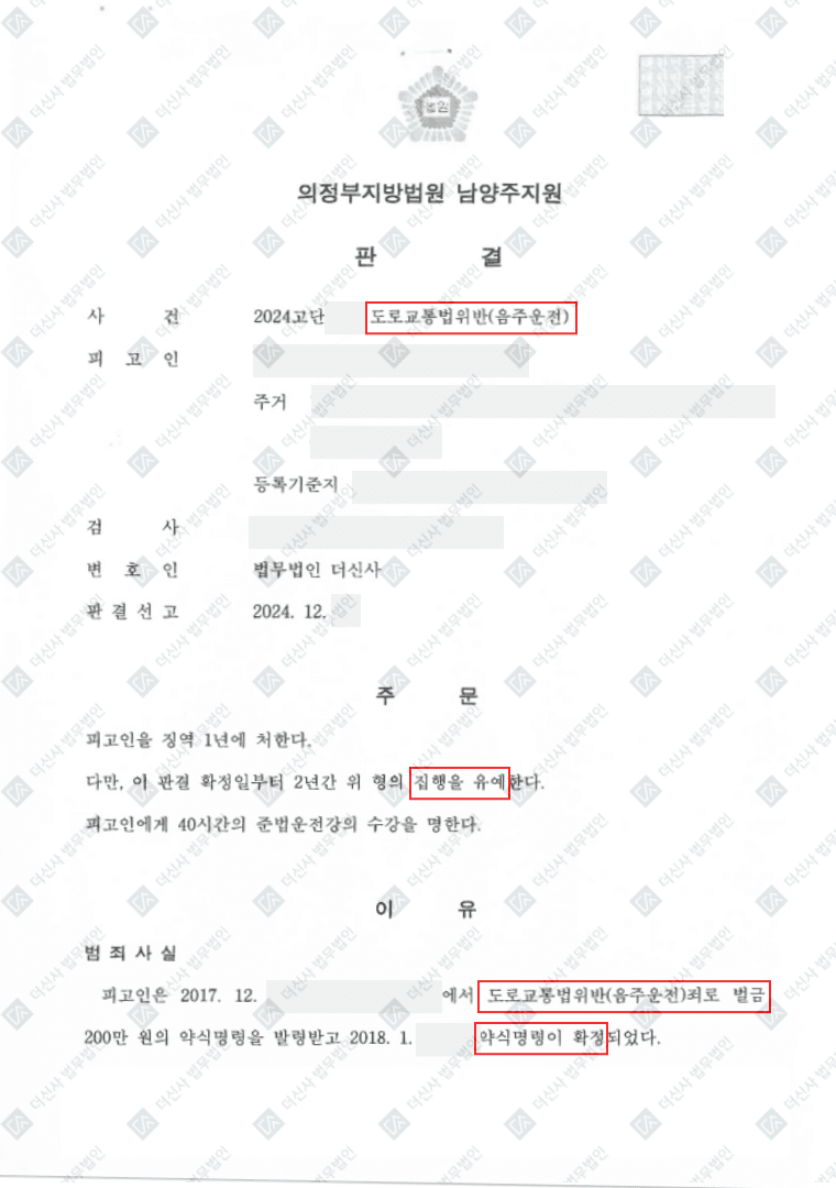 사건 결과: 징역 1년, 집행유예 2년, 준법운전강의 40시간