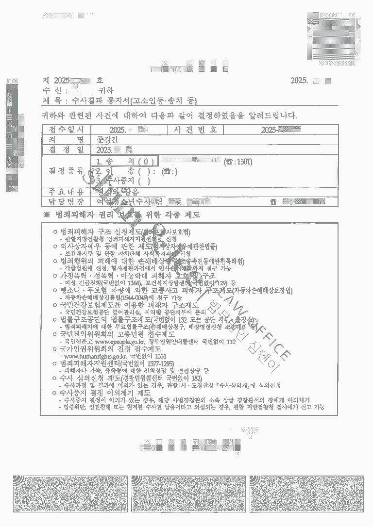 - 오늘의 사례는 피해자가 뒤늦게 피해 사실을 알게 되었고, 혼자서는 추가 고소가 가능한지조차 판단하기 어려운 상황이었습니다. 심앤이는 다양한 사건 경험을 바탕으로 고소장을 신속하게 제출해 사건화를 시키고, 수사기관을 설득하는 논리적인 의견서를 제출하는 등 적극적을 대응하여, 가해자의 준강간 혐의에 대한 송치 결정을 이끌어냈습니다.
