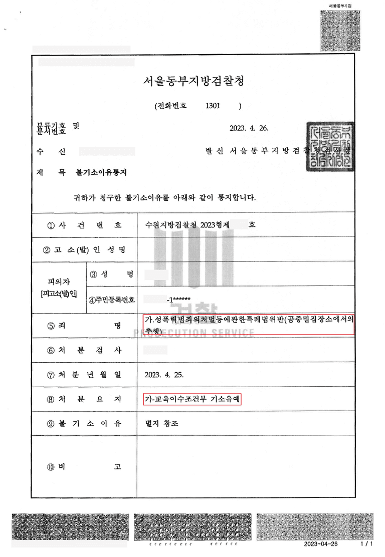 검찰은 A씨에게 성폭력 재범방지 교육 이수를 조건으로 기소유예 결정을