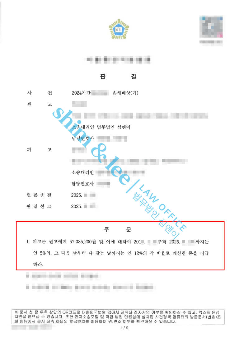 -판결이 확정된 후 담당 변호사님은 상대측으로부터 변제 의사를 확인하였고, 의뢰인은 사건 발생일로부터 약 10년간의 지연 이자를 포함해 총 1억 원이 넘는 금액을 변제 받게 되었습니다. 미제 사건으로 장기간 방치되었던 만큼 이자가 크게 불어나게 되었고 전부 변제 받을 수 있었습니다.