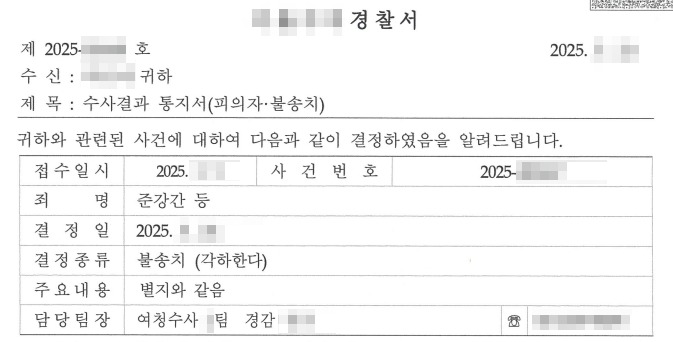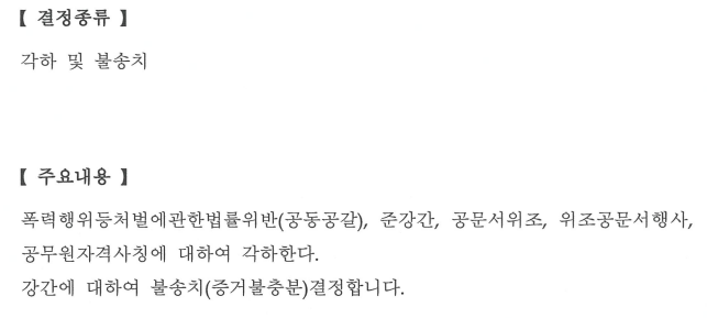 어쨌건, 우리 의뢰인은 변호인의 도움을 받아 법정에 서지 않고도 모든 사건을 마무리지을 수 있었습니다. 바로 지금, 여기에 처분결과 통지서를 공개합니다.