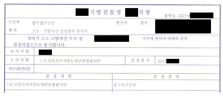 이 사건과 같이, 스토킹처벌법 위반 사건의 경우에도 어떻게 대응을 하느냐에 따라 수사기관의 결정은 달라질 수 있습니다.