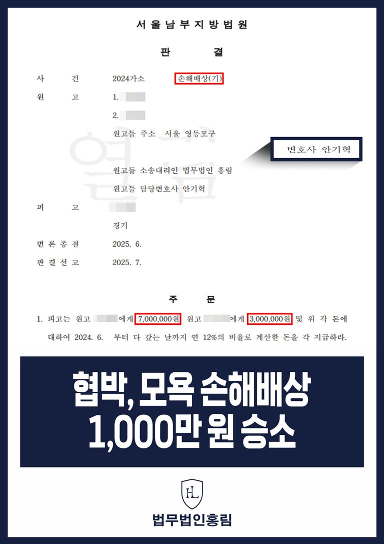 이에 따라 피고는 원고 A씨에게 7,000,000원, 공동 원고에게 3,000,000원의 손해배상금을 지급하라는 판결을 받았으며, 이는 협박, 모욕 손해배상 1,000만원 승소를 공식적으로 인정받은 결과입니다.