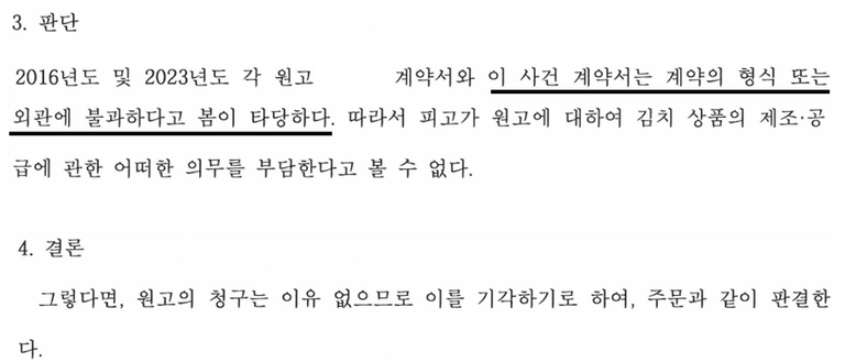 원고가 증거로 제출한 계약서는 형식 또는 외관에 불과하다는 점을 주장 입증하여, 피고 회사는 원고 회사에 대해 김치의 제조공급에 관한 의무를 부담하지 않음을 주장