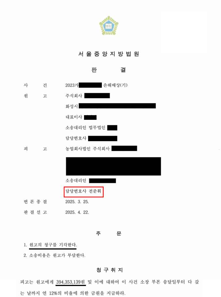 원고 회사는 이 사건으로 인해 대기업A와의 납품공급계약이 해지되었음을 주장하면서 피고 회사에게 394,353,139원의 손해배상을 청구했습니다.