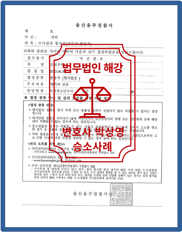 저희 법무법인 해강은 법리적인 검토를 통하여 의뢰인 상황에 맞춘 변호인 의견서 등 작성을 통하여 의뢰인을 위해 최선을 다하였고 이에 [무혐의]을 이끌어냈습니다.