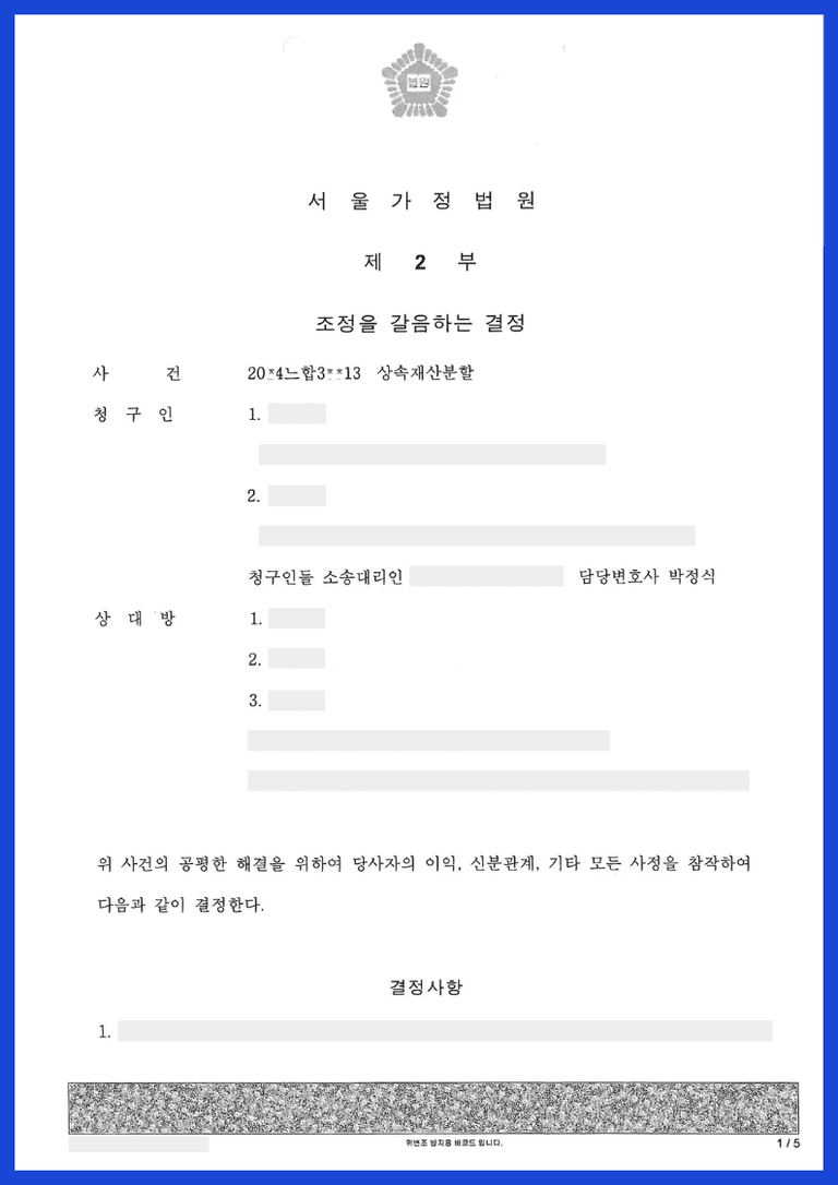③ 청구인들과 상대방들은 위에서 정한 것 외에는 향후 서로에 대하여 피상속인과 관련된 민사, 형사, 가사 등 일체의 청구를 하지 않는다고 하면서, 이상을 바탕으로 조정을 갈음하는 결정을 통하여 청구인들과 상대방들 사이의 상속재산분할 관련 분쟁을 원만히 해결하였습니다.
