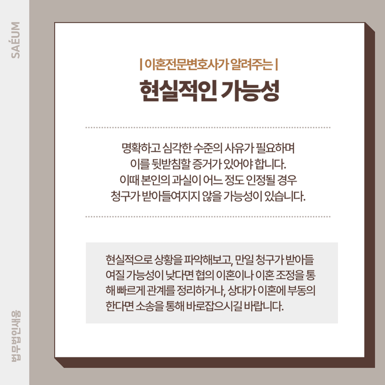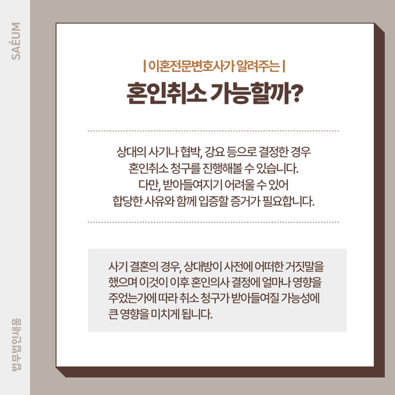 그러나 이후 B씨의 주장은 모두 거짓임이 드러나게 되었는데요. 이에 A씨는 이혼을 원했지만 상대방은 이를 거부하였고, 빠르게 관계를 정리하기 위해 법무법인 새움을 찾아오셨습니다. A씨는 이혼이 아닌 혼인취소로 진행하기를 바라셨습니다. 혼인취소의 경우 중혼이나 근친혼, 사기나 강박으로 인한 혼인의사 표시를 한 경우 등에 적용해볼 수 있는데, 이 사건은 사기로 인한 혼인이었기 때문에 이를 사유로 하여 혼인취소를 청구할 수 있는 상황이었습니다.
