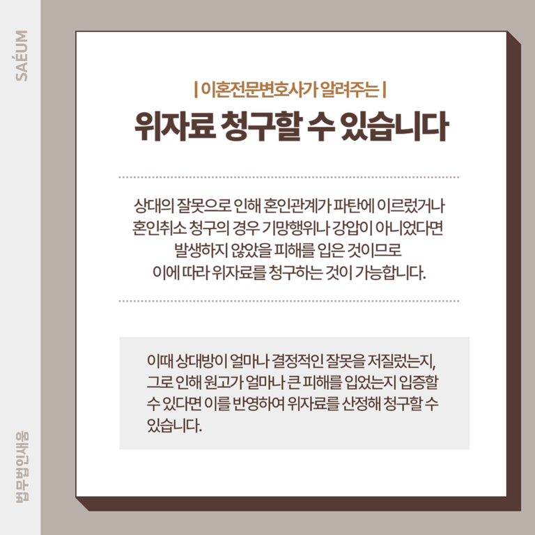 사기 결혼으로 인한 혼인취소 청구 혹은 소송이나 조정을 진행할 경우에는 위자료를 함께 받아낼 수 있습니다. 상대방의 잘못으로 인해 혼인관계가 파탄에 이르게 된 것이며, 특히 혼인취소 청구의 경우 상대방의 기망행위나 강압이 아니었다면 발생하지 않았을 피해를 입은 것이므로 이에 따라 위자료를 청구하는 것이 가능합니다. 이때 상대방이 얼마나 결정적인 잘못을 저질렀는지, 그로 인해 얼마나 큰 피해를 입었는지를 반영하여 위자료를 산정해 청구할 수 있습니다.