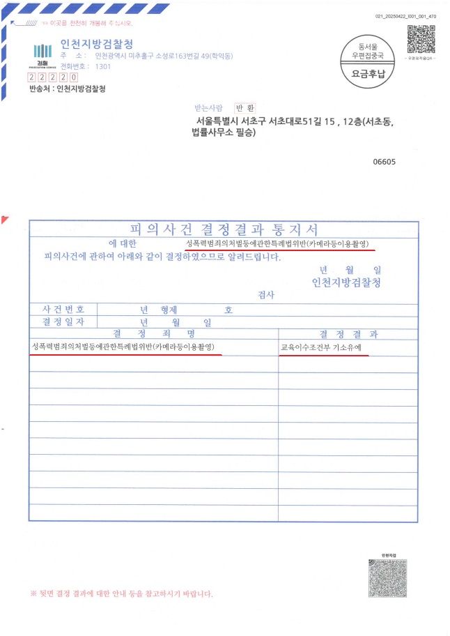 그러나 안내해드린 양형자료들과 선처를 호소하는 변호인의견서 및 경찰 조사 동행, 합의 진행을 통해 인천지방검찰청은 의뢰인님에게 "기소유예처분"을 내렸습니다. 이로 인해 의뢰인님께서는 전과 기록이 남지도 않고, 신상정보 공개, 고지, 등록 대상도 되지 않았습니다.