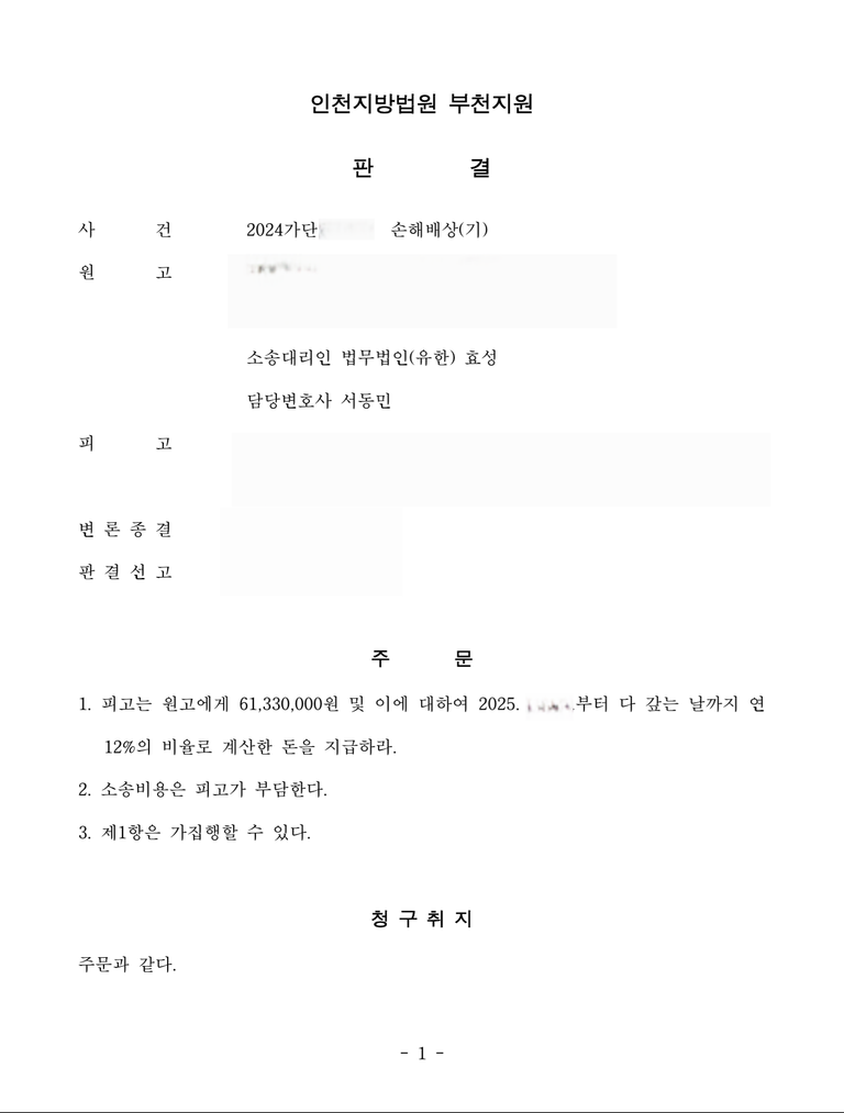 저는 즉각 입건된 가해자를 피고로 하여 민사소송 손해배상청구소송을 제기하였고 법원은 원고 승소 판결을 선고하여 의뢰인은 피해액을 반환받았습니다.